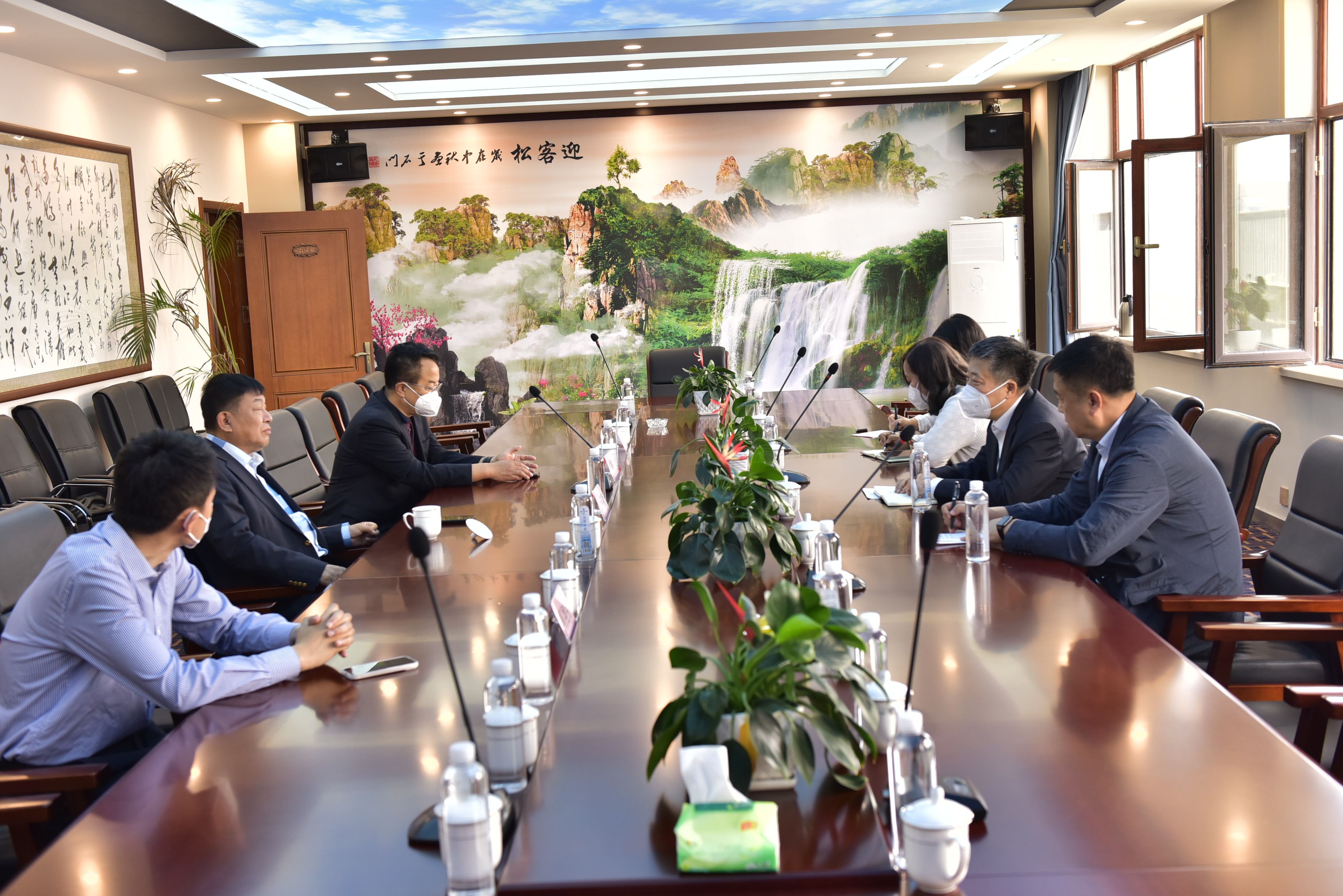 參觀后,來到集團(tuán)多媒體會(huì)議室,集團(tuán)領(lǐng)導(dǎo)與市外辦調(diào)研組進(jìn)行進(jìn)一步的交流座談。公曉穎董事長(zhǎng)向市外辦調(diào)研組介紹集團(tuán)最近的發(fā)展情況、集團(tuán)對(duì)外投資和對(duì)外貿(mào)易開展情況;韓英彪總經(jīng)理向調(diào)研組介紹了集團(tuán)在蓮花山正在建設(shè)的北藥養(yǎng)生谷項(xiàng)目情況。