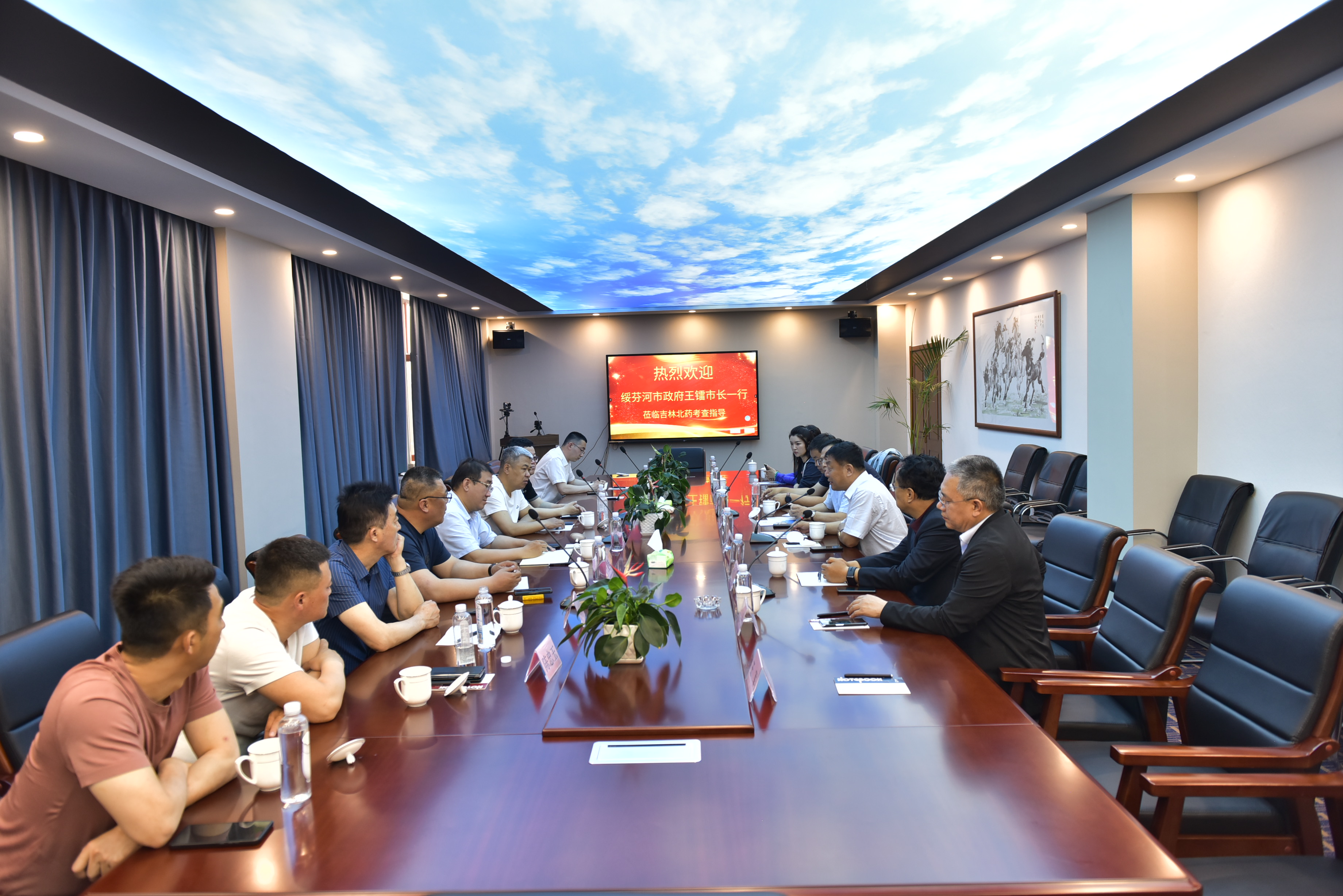 吉林北藥集團(tuán)董事長(zhǎng)公曉穎先生首先對(duì)綏芬河市人民政府考察團(tuán)王鐳市長(zhǎng)一行的到來(lái)表示熱烈歡迎,并重點(diǎn)介紹了集團(tuán)的發(fā)展歷程和未來(lái)的發(fā)展方向。他表示,吉林北藥集團(tuán)緊跟時(shí)代步伐,通過(guò)建設(shè)吉林北藥智慧物聯(lián)煎藥中心、吉林北藥中藥制劑生產(chǎn)基地、藥品標(biāo)準(zhǔn)化倉(cāng)儲(chǔ)物流中心,完整了集團(tuán)產(chǎn)業(yè)鏈,通過(guò)“長(zhǎng)春蓮花山北藥中醫(yī)藥文化養(yǎng)生谷項(xiàng)目”,謀劃中藥產(chǎn)學(xué)研一體化、中醫(yī)藥產(chǎn)業(yè)化、實(shí)現(xiàn)我們北藥的品牌升級(jí)。綏芬河作為百年口岸和最北自貿(mào)區(qū),區(qū)位優(yōu)勢(shì)、政策優(yōu)勢(shì)、產(chǎn)業(yè)優(yōu)勢(shì)明顯,發(fā)展空間潛能大,將進(jìn)一步深入了解,搶抓機(jī)遇,對(duì)接合作,共同推動(dòng)綏芬河中醫(yī)藥產(chǎn)業(yè)做大做強(qiáng)。